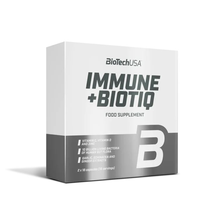 Zloženie: Imunitné kapsuly: Fruktooligosacharidy 27%, obal kapsuly [želatína, glazúra (šelak), farba (oxidy a hydroxidy železa), regulátor kyslosti (hydroxid amónny), regulátor kyslosti (hydroxid draselný)], zázvor (Zingiber officinale) extrakt z podzemku 14,2% , zimolez fialový (Echinacea purpurea) bylinkový extrakt 14,2%, cesnak (Allium sativum) výťažok z cibule 13,7%, objemové činidlo (celulózová guma), kyselina L-askorbová, protihrudkujúca látka (oxid kremičitý, horečnaté soli mastných kyselín), zinok oxid, cholekalciferol.Kapsuly Biotiq: Biotiq formula 54,7% [Lactobacillus helveticus LAFTI L10, Lactobacillus rhamnosus GG, Bifidobacterium longum Rosell®-175, Lactobacillus paracasei LAFTI L26, zemiakový škrob, protihrudkujúca látka (horečnaté soli mastných kyselín), kyselina L-askorbová] objemové činidlo (celulózový gél), obal kapsuly [želatína, glazúra (šelak), farba (oxidy a hydroxidy železa), regulátor kyslosti (hydroxid amónny), regulátor kyslosti (hydroxid draselný)], protihrudkujúce činidlo (horečnaté soli mastných kyseliny, oxid kremičitý).Vyrobené v závode, ktorý vyrába mlieko, vajcia, lepok, sóju, zeler, ryby, kôrovce, oxid siričitý a orechy obsahujúce potraviny.