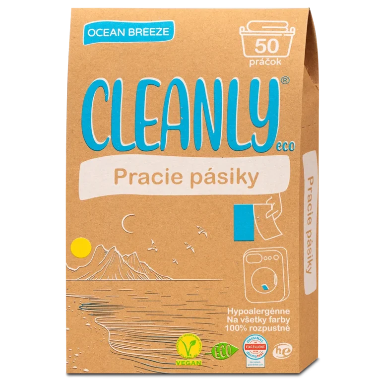 Pracie pásiky Cleanly eco s vôňou Ocean Breeze, ktoré umožnia prať ekologicky a šetrne, sú praktickou alternatívou k tradičným pracím prostriedkom. Jednoduché a ekologické pranie bez zbytočného odpadu, šetrné k prírode. Vhodné na farebnú a bielu bielizeň, pre najmenších, pre citlivú pokožku.