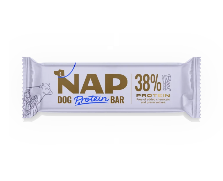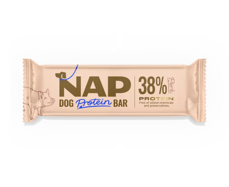 NAP DOG PROTEIN BAR výživná a praktická tyčinka vyvinutá špeciálne pre psy. Obsahuje vysoký podiel kvalitných bielkovín, vitamínov a minerálov – bez zbytočných konzervantov, stabilizátorov. 100% prírodné zloženie. Je vhodná pre aktívne psy, ktorí potrebujú doplniť energiu po športovom výkone, ale aj pre bežných domácich miláčikov ako zdravá pochúťka na prechádzke alebo na výlete.