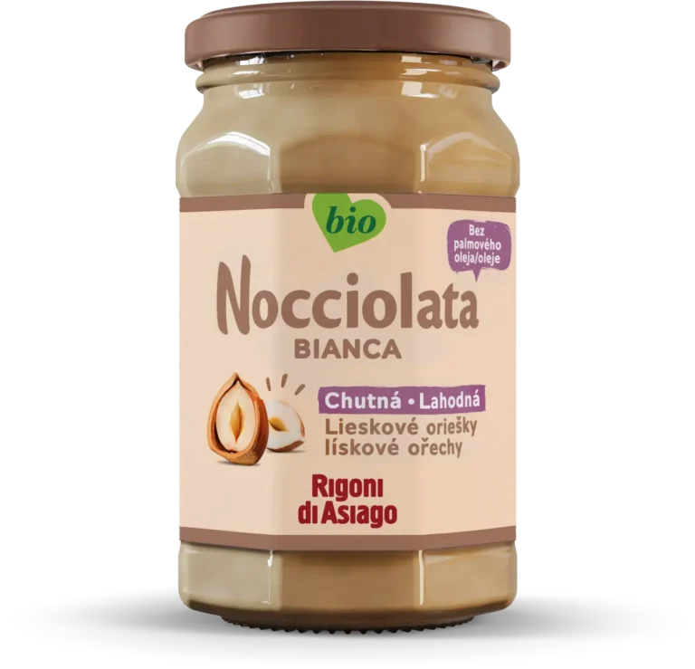 Nocciolata Bianca je unikátna nátierka, ktorá obsahuje 30 % lieskových orieškov (základná zložka), mlieko, bourbon vanilku a kakaové maslo.